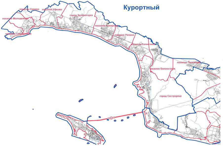 Курортный район Петербурга расположен вдоль побережья Финского залива. Его территория составляет 28,2 тыс. га, население 67,9 тысяч человек. В летние месяцы число жителей района увеличивается как минимум втрое. В состав Курортного района входят города Сестрорецк, Зеленогорск, поселки Белоостров, Комарово, Солнечное, Смолячково, Серово, Песочный, Репино, Ушково, Молодежное.